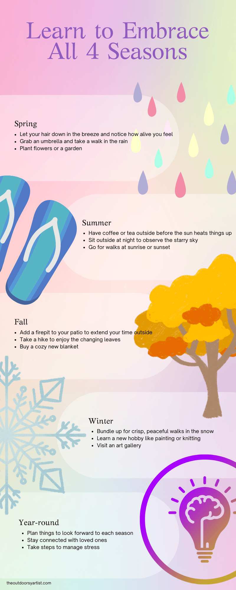Connecting with nature can have a positive impact on your mood and mental health. Make an effort to engage with nature in each season. This may include taking a walk in the park, going for a hike, or visiting a botanical garden. Try to notice the changes in nature as the seasons change, and appreciate the beauty around you. Nature is one of the greatest teachers in embracing change.